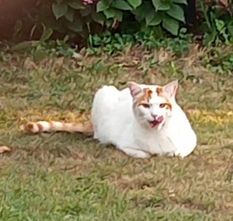 Mâle castré Blanc avec la queue et quelques tâches rousses. Grand chat Peureux